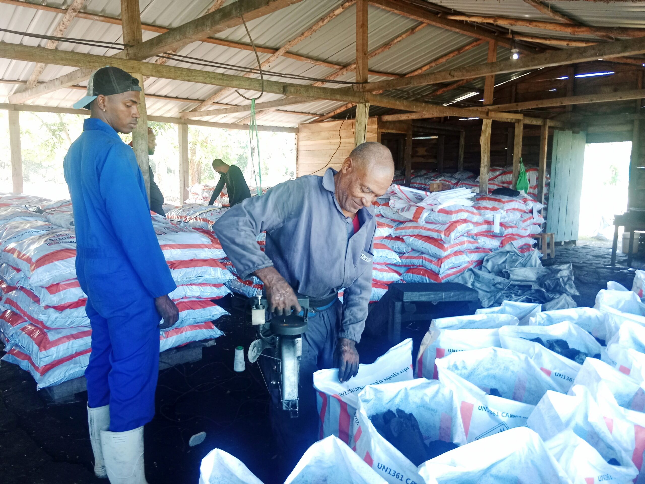 Disney Manduley, trabajador del Gobierno Caimanera, nos comentó: “Nuestro objetivo es contribuir con este proceso de embasado y que cada saco cumpla con los estándares internacionales. La calidad del embalaje es tan importante como la calidad del carbón mismo.”